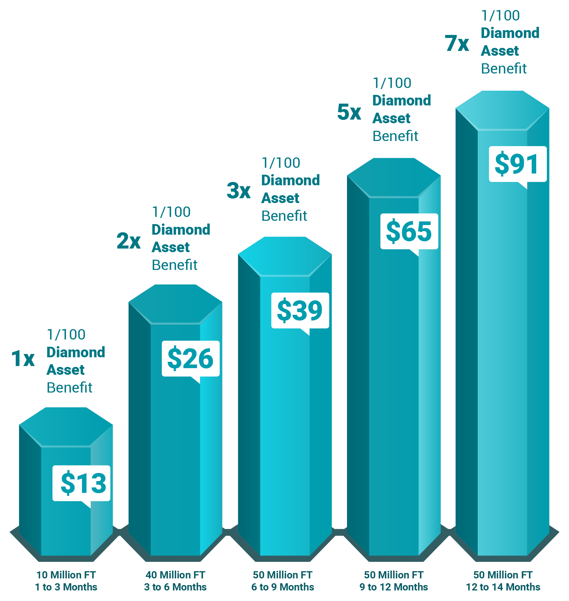 The reference of calculation for the financial value of the diamond is determined by one carat. A one carat diamond round, brilliant, cut and polished is based on 1/100, that means 100 cut and polished diamonds make up one carat in weight. Therefore, the financial value of Facet Token is based on one carat or 1/100 carat. The base of calculation of Facet value is 1/100 carat, calculated using professional reference, on six charts of reference from size 0.01 to 0.29 carats under our Patented Algorithm.
